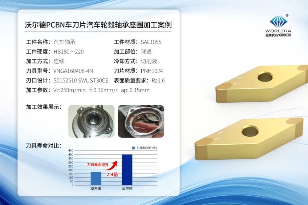在汽車制造過程中,輪轂軸承座圈的加工是一個關(guān)鍵的環(huán)節(jié)。由于軸承座圈的材料通常選用淬硬鋼,其硬度高、耐磨性好的特點(diǎn)使得加工過程變得異常復(fù)雜和艱難。傳統(tǒng)的刀具在加工過程中往往容易出現(xiàn)磨損快、壽命短等問題,嚴(yán)重影響了加工效率和質(zhì)量。然而,在使用沃爾德新型PCBN車刀片進(jìn)行加工時,這些問題得到了有效解決。