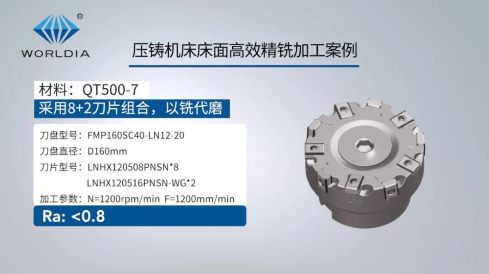針對(duì)這一難題,沃爾德給出了FMP-LN方肩銑刀方案。該方案選用了直徑D160mm的FMP-LN銑刀(刀盤:FMP160SC40-LN12-20),刀片采用8+2組合(LNHX120508PNSN和LNHX120516PNSN-WG)。