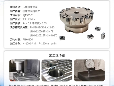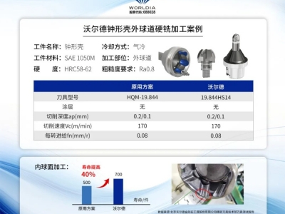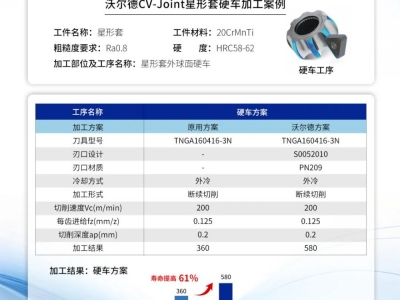 一、背景介紹:沃爾德PCBN刀片加工風(fēng)電軸承案例風(fēng)電行業(yè)軸承有以下加工難點(diǎn):●工件材料硬度高,熱處理后硬度在HRC58-62,對刀具耐磨性有很高要求;●零件尺寸大,風(fēng)電回轉(zhuǎn)支持軸承直徑通常超過1m,刀具要求有持續(xù)抗高溫能力;●熱處理后零件變形造成余量不均勻,以及軸承滾道形狀等因素,要求刀具有抗斷續(xù)加工能力;●加工精度和粗糙度要求高,工件的裝配精度高對其尺寸公差和形狀公差有很高的要求,其公差范圍通常