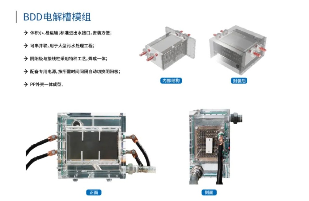BDD電化學(xué)氧化技術(shù)可對高濃度有機廢水進行前期預(yù)處理以降低毒性、提高可生化性,或者后段深度處理直接降解到達標(biāo)。作為廢水處理的重要工藝,可針對水體中的難降解有機物進行氧化分解,而且能結(jié)合膜過濾、臭氧催化氧化、蒸發(fā)等工藝來實現(xiàn)廢水處理的穩(wěn)定達標(biāo)。