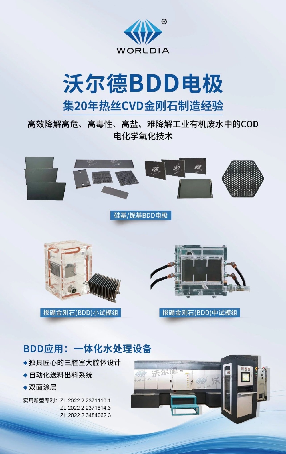 四、沃爾德BDD電化學(xué)氧化法的應(yīng)用BDD電催化氧化法是通過施加一定的電勢使BDD電極上產(chǎn)生極具活性和具有強氧化能力的羥基自由基(·OH)、氧氣和其他具有氧化能力的離子。這些離子通過一系列氧化還原反應(yīng)將有機物氧化為無害的物質(zhì),從而達到水處理的目的。同時,BDD電極表面的高導(dǎo)電性使得電子的輸運速度加快,有助于提高電化學(xué)反應(yīng)的速率和效率。