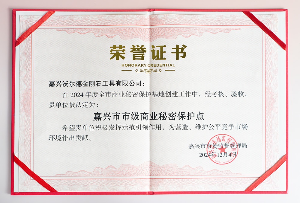 在2024年度嘉興市商業(yè)秘密保護(hù)基地創(chuàng)建工作中,嘉興沃爾德金剛石工具有限公司經(jīng)考核驗收,成功獲評嘉興市市級商業(yè)秘密保護(hù)示范點。