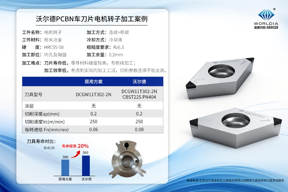 沃爾德PCBN車刀片:電機(jī)轉(zhuǎn)子加工新突破,壽命提高20% 2024-08-08 13:37:34 北京沃爾德金剛石工具股份有限公司 瀏覽次數(shù) 4771 一、產(chǎn)品背景:沃爾德PCBN車刀片隨著國(guó)內(nèi)新能源汽車的產(chǎn)量逐年增加,其核心部件的加工工藝及加工方法受到越來(lái)越多的汽車零部件生產(chǎn)商及刀具制造商的關(guān)注,本案例介紹沃爾德PCBN車刀片在加工電機(jī)轉(zhuǎn)子上的應(yīng)用。二、案例介紹:沃爾德PCBN車刀片三、方案特點(diǎn):沃爾德PCBN車刀片●按照實(shí)際加工工況,設(shè)計(jì)特殊形式的刃口;●采用了兼顧耐磨性和抗沖擊性的PCBN材質(zhì)。 上一條鐘形殼硬車加工 | 沃爾德助力新能源汽車制造 下一條新品發(fā)布 | 沃爾德PCBN刮削刀具及配套PSC刀柄系統(tǒng)
