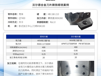 一、背景介紹:沃爾德PCBN刀片加工風(fēng)電軸承案例風(fēng)電行業(yè)軸承有以下加工難點(diǎn):●工件材料硬度高,熱處理后硬度在HRC58-62,對刀具耐磨性有很高要求;●零件尺寸大,風(fēng)電回轉(zhuǎn)支持軸承直徑通常超過1m,刀具要求有持續(xù)抗高溫能力;●熱處理后零件變形造成余量不均勻,以及軸承滾道形狀等因素,要求刀具有抗斷續(xù)加工能力;●加工精度和粗糙度要求高,工件的裝配精度高對其尺寸公差和形狀公差有很高的要求,其公差范圍通常